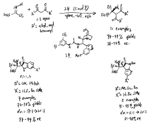 - ^ Kano, Taichi; Song, Sunhwa; Kubota, Yasushi; Maruoka, Keiji (2011-12-15). "Highly Diastereo- and Enantioselective Mannich Reactions of Synthetically Flexible Ketimines with Secondary Amine Organocatalysts". Angewandte Chemie International Edition. 51 (5): 1191–1194. doi:10.1002/anie.201107375. ISSN 1433-7851. PMID 22173941.