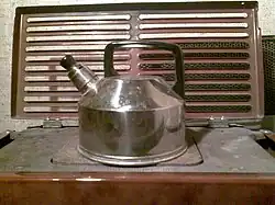 A whistling kettle is a kettle fitted with a device that emits an audible whistle when the water in the kettle starts to boil. The action of steam passing through the device causes vibration, in turn creating the sound, known in physics as a tone hole.[10]