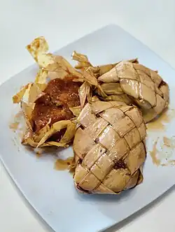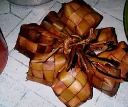 Ketupat (Indonesian and Malay pronunciation: kəˈt̪upat̪̚) is a type of compressed rice cake commonly found across Maritime Southeast Asia, particularly in Indonesia, Malaysia, Brunei, Singapore, Timor-Leste and southern Thailand. It is traditionally made by filling a pouch woven from young palm leaves with rice, which is then boiled until the grains expand and form a firm, compact mass. Ketupat is typically served as an accompaniment to meat, vegetable or coconut milk-based dishes and is widely prepared for festive and ceremonial occasions. The dish is known by various regional names, including kupat (Javanese and Sundanese), tipat (Balinese), katupat (Banjar), katupa (Tetum), katupa’ (Makassarese), topat (Sasak) and katupek (Minangkabau), among others.[13]