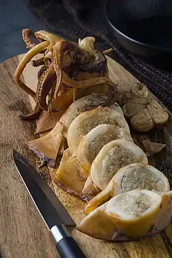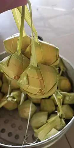 Variations of this practice are found across the region. In southern Thailand, a dish known as khao tom sam liap (ข้าวต้มสามเหลี่ยม), or tom bai kaphor, consists of glutinous rice steamed inside triangular-shaped palm leaf pouches. It is commonly prepared for cultural and religious festivals, including Sart Duean Sib (ancestral merit day), the Chak Phra procession and ordination ceremonies. Traditionally made with plain white or black glutinous rice, contemporary versions may include fillings such as mung beans, pork floss, sweet egg threads or bananas. Like ketupat, this dish exemplifies the adaptation of leaf-wrapping techniques to local customs and ritual contexts.[65][66]