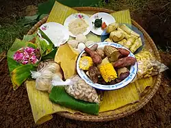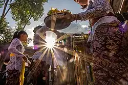 In Hindu-majority regions of Indonesia, particularly in Bali and parts of Java, ketupat plays an important role in religious rituals and ceremonial offerings. In Balinese Hinduism, ketupat, locally known as tipat, is included in temple offerings (banten) presented to Dewi Sri, the goddess of rice, fertility and prosperity.[23][24] During the Kuningan festival, which marks the conclusion of the Galungan celebrations, Balinese families prepare and weave tipat as part of offerings to honour ancestral spirits and celebrate the triumph of dharma over adharma.[11] The woven palm leaf and the rice within symbolise gratitude for sustenance and spiritual harmony. Following the ceremony, the tipat may also be consumed.