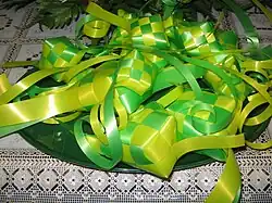 In Indonesia, Malaysia, Singapore and Brunei, ketupat motifs made from colourful ribbons or plastic are commonly used as festive decorations during Hari Raya Aidilfitri. Known as ribbon ketupat, these ornamental versions are typically hung in homes, shopping centres and public spaces, often alongside oil lamps (pelita) and festive lights to create a celebratory atmosphere. While ketupat is traditionally a food item, its woven diamond-shaped form has become a widely recognised symbol of the holiday.[35]