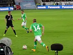 De Bruyne scored his first goal of the 2014–15 season on 2 October 2014, volleying in a clearance from outside the box to salvage a 1–1 draw against Lille in the Europa League.[36] In the third group match away to Krasnodar on 23 October, De Bruyne scored twice as Wolfsburg secured their first win in the competition with a 4–2 victory.[37] On 30 January 2015, he scored another brace in a 4–1 home win against Bayern Munich, their first Bundesliga defeat since April 2014.[38] On 1 March 2015, De Bruyne assisted three goals in a 5–3 win over his former club Werder Bremen.[39]