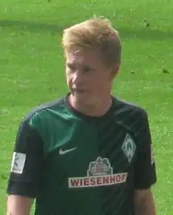 On 31 July 2012, Chelsea announced that De Bruyne was to join Werder Bremen in the Bundesliga on a season-long loan deal.[18] He scored his first goal for Bremen in a 3–2 defeat to Hannover 96 on 15 September, netting from 11 yards out after being played in by Eljero Elia.[19][20] He continued his good form, scoring in Bremen's next game, a 2–2 draw with VfB Stuttgart, on 23 September.[21][22] De Bruyne got back on the score sheet on 18 November, scoring the winning goal – despite his team being down to 10 men – as Bremen came from a goal down to defeat Fortuna Düsseldorf 2–1.[23][24]