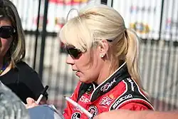 While in high school, Harvick began racing late models part-time in 1992 in the NASCAR Featherlite Southwest Series.[6] During the racing offseason, he competed on the North High School wrestling team, qualifying for a CIF Central Section title in his weight class his senior year.[7] Harvick also played baseball, basketball, football, and soccer.[6] After graduation, he attended Bakersfield College with the intention of majoring in architecture,[6] but later dropped out in order to pursue a full-time racing career.[3]