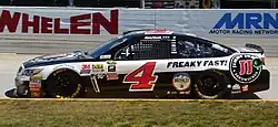 It was officially confirmed on January 22, 2013, that Harvick would be switching teams and joining Stewart-Haas for the 2014 season. Harvick and Childress said the parting was mutual and that it was time for Harvick to move on. Stewart-Haas Racing did not confirm what sponsor or number Harvick would be given. During the official reports it was reported, but not officially told, that Budweiser was interested in staying with Harvick.[21] On July 12, 2013, it was confirmed that Harvick would drive the No. 4 Chevrolet, and would replace Ryan Newman, who parted ways with Stewart-Haas Racing at the end of the season. Harvick retained Budweiser as his primary sponsor for 21 races, with Jimmy John's sponsoring the remaining races for the 2014 season.[22] In October, it was announced that Harvick would also run a partial schedule in the Nationwide Series in 2014, competing in a minimum of twelve races for JR Motorsports.[23] Despite a second-place finish in his Budweiser Duel in a photo finish against Matt Kenseth and Kasey Kahne, Harvick failed post-race inspection, and his Duel finish was disallowed. As a result, Harvick started the Daytona 500 in 38th, getting in the 500 on a Provisional. Harvick ran upfront during the Daytona 500, but was caught up in a last-lap crash leaving turn four, and was scored in the thirteenth position.