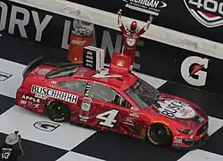 Harvick started his 2019 season by winning Duel 1 of the 2019 Gander RV Duels at Daytona. He finished 26th at the 2019 Daytona 500 after a late crash. Following Daytona, Harvick went on to finish in the top-ten six straight times including three top-fives. Following Texas was an up-and-down stretch that lasted until race #19. At Bristol Motor Speedway, he finished a mediocre thirteenth after getting through traffic. Richmond was not bad as he was consistently in the top-five all night and finished fourth. Things took a hard turn at Talladega where he earned his second DNF of the season, all on superspeedways. Harvick bounced back with a fourth-place finish at Dover. He got the pole at Kansas and looked as if he was going to win but a poor stop by his crew members regulated him to finish thirteenth instead. Harvick almost won the All-Star race but finished second behind Kyle Larson. He then finished tenth at the Coca-Cola 600. A loose wheel at Pocono made him suffer a 22nd place finish. Then in the next two races, he finished inside the top-seven. He then finished outside the top-ten in the next three races. At Chicagoland, Harvick did well in both stages but a loose wheel got him to finish a mediocre 14th-place finish. Then next weekend, he finished 29th after getting collected in the Big One but still was able to run at the finish line driving his wrecked car. Then Kentucky was worse as he finished 22nd again. Heading into New Hampshire, Harvick had decent numbers but still was winless throughout the season after nineteen races. Then in the next seven races, he finished in the top-seven in six races. His only finish outside the top-ten was at Bristol as he suffered a DNF thanks to a transmission problem. He added this great momentum with wins at New Hampshire, Michigan, and Indianapolis. His Playoffs was also consistent as in the Round of 16, he finished second at Las Vegas, seventh at Richmond, and finished third at the Charlotte Roval to advance to the Round of 12 and his average finish during those three races in the Round of 16 was a 4.0 during that stretch.[33] At Talladega, Harvick made his 677th career start in the Cup Series, one more than the total career starts of Dale Earnhardt.[34] His worse finish during the Playoffs was seventeenth at Talladega, after getting collected in the Big One but once again was able to finish the race. He scored his fourth win of the season at Texas to make his fifth appearance in the Championship 4 in the last six years.[35] He went on to finish third in the standings for the third consecutive season after finishing fourth at Homestead.
