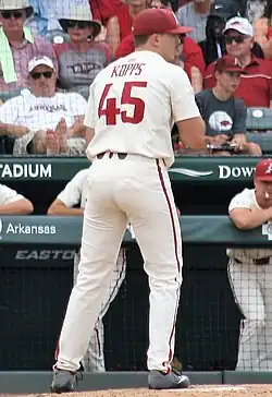 After his poor 2020 season, Kopps was unsure if the Arkansas coaches wanted him on the team in 2021, but they assured him that they did.[2][3] He reworked his pitching delivery to be more natural and less over-the-top based on how he was playing fetch with his dog.[4] In 2021, his senior year, Kopps had a 12–1 win–loss record with a 0.90 ERA with 11 saves in 89+2⁄3 innings across 33 games. His ERA led all NCAA Division I pitchers.[1] He was named the Southeastern Conference Baseball Pitcher of the Year.[5] He won the Collegiate Baseball National Player of the Year Award, Stopper of the Year Award, the Dick Howser Trophy, and the Golden Spikes Award.[2][6][7]