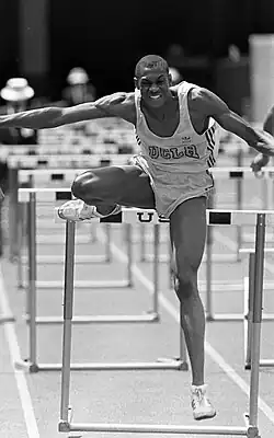 At Jordan High School, the same high school that Florence Griffith-Joyner had attended years earlier, Young was first successful as a 110-meter hurdler, finishing in third place at the 1984 CIF California State Meet.[4] As a UCLA "walk-on", Young was 5th place at the 1985 Pac-10 championships running the 400-meter hurdles in 51.09 seconds. This all changed his sophomore year. Limiting the amount of time and effort in other events (110 hurdles, triple jump, and long jump) he applied more detail towards the 400-meter hurdles and 4 × 400-meter relay. The Bruin won the 1986 Pac-10 400 m hurdles title on the advice of Andre Phillips sharing his knowledge of running this distance at the Los Angeles Coliseum under windy conditions. There he set a then Pac-10 record of 49.02 seconds. While in Indiana for that year's 1986 NCAA Championships, Young was a surprise second-place finisher behind the 1984 Olympic silver medalists, Danny Harris of Iowa State. While running between the fourth and fifth hurdles, he took eleven (11) strides between the barriers, a feat only repeated by him six years later during the first round of 1992 Barcelona Olympic 400-meter hurdles. At the 1987 NCAA championships at LSU, he captured a pair of NCAA titles in 400-meter hurdles and 4 × 400-meter relay. He and his Bruin 4 × 400 m relay teammates of Anthony Washington, Henry Thomas, and Danny Everett set a then NCAA and collegiate record of 3:00.55. In 1988 during his senior year at UCLA, Young defended his third PacC-10 400 m hurdles title and won his second NCAA 400 m hurdles title, running 47.85 seconds. With the addition of California prep 400 m specialist Steven Lewis, the Bruins' 4 × 400 m relay team became the first ever collegiate team to run under 3 minutes (2:59.91; relay splits: Steve Lewis 45.1, Kevin Young 44.3, Danny Everett, 45.4, Henry Thomas 45.1), 2:59.91 CR. These records stood for 17 years, with the 400 m hurdles being broken by Kerron Clement (47.56) and relay by LSU (2:59.59). Kevin Young finished his senior year as team captain and the most valuable male collegiate athlete in the United States, winning the Jumbo Elliott Award.[5] Young graduated from UCLA setting junior and senior class records in the 400 m hurdles (48.15 and 47.72 respectively).