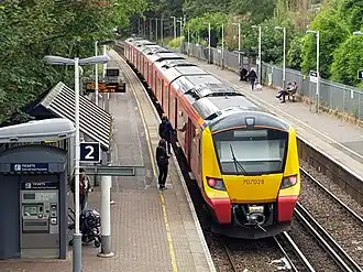 ![]() Kew Bridge station with platform shelters and Class 707 EMU no.707028 calls on platform 2 in June 2018 | |