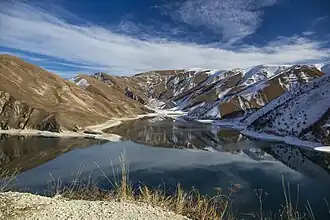 Lake Kezenoy-am (Lake Goluboye, Russian: Кезенойам, Голубое; Chechen: Къоьзана Iaм, romanized: Q̇özana Jam) is the deepest lake in the Caucasus Mountains, in the Russian Federation, mostly in Chechnya but partly in Dagestan. It goes through Andiyskiy Khrebet (Andian Ridge). It is situated at an altitude of 1,870 m (6,140 ft) above sea level and covers an area of 2.4 km2 (0.93 sq mi). The maximum depth of the lake is 74 m (243 ft). In winter the surface of the lake freezes and in summer the water temperature is around 5 °C (41 °F). The lake water has a year-round supply of oxygen in which plankton survive. Salmo ezenami, a rare species of trout, are native only to the lake; however, their population is threatened with extinction due to the introduction of European chubs (Squalius cephalus) which consume their fry.[1]