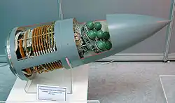 The Kh-31 (Russian: Х-31; AS-17 'Krypton')[7] is a Soviet and Russian air-to-surface missile carried by aircraft such as the MiG-29, Su-35 and the Su-57. It is capable of Mach 3.5 and was the first supersonic anti-ship missile that could be launched by tactical aircraft.[6]