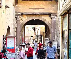An important factor in the development of Cairo's economic center was the growing number of waqf institutions, especially during the Mamluk period. Waqfs were charitable trusts under Islamic law which set out the function, operations, and funding sources of the many religious/civic establishments built by the ruling elite.[7] Funding sources often included the revenues of designated shops or other commercial establishments. Among the early and important examples of this institution in Cairo's center was the complex of Sultan Qalawun, built in 1284–85, which included a madrasa, hospital, and mausoleum. A part of the complex's revenues came from a qaysariyya (a bazaar or market complex made up of rows of shops) that was built in front of the nearby Ayyubid-era madrasa of al-Salih. This qaysariyya was a prominent early example of the purpose-built commercial structures that came to be erected in Cairo under the Mamluks as part of a waqf. Qalawun's qaysariyya had a front on the Qasaba street while some of its shops were reached by an inner alley off the main street.[5]