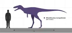 Khankhuuluu (/xɑːnˈxuːluː/ khahn-KOO-loo; lit. 'dragon prince')[1] is an extinct genus of early tyrannosauroid theropod dinosaurs from the Late Cretaceous of what is now the Gobi Desert in Mongolia. The genus contains a single species, Khankhuuluu mongoliensis, known from several skull bones and two partial skeletons, including shoulder, pelvic, and hindlimb bones, and several vertebrae from the back and tail. The remains were discovered in 1972 and 1973 and first described in 1977 as belonging to the Chinese Alectrosaurus. Later researchers recognized the uniqueness of the bones, and they were eventually named as belonging to a new species in 2025. Khankhuuluu is a medium-sized tyrannosauroid with a shallow skull and long, slender legs. Its skeleton demonstrates a unique combination of anatomical traits seen in both earlier-diverging (basal) tyrannosauroids and the later-diverging (derived) tyrannosaurids.