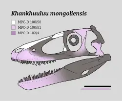In profile, the skull of Khankhuuluu is shallow, comparable to juvenile tyrannosaurids and members of the Alioramini. The textured ornamentation on the skull is reduced in comparison to later species, in which these horns likely functioned as intimidation structures or mating displays.[8] Like most eutyrannosaurians ('true tyrannosaurs', the clade including giant Asian and North American taxa such as the tyrannosaurids),[9] the fused midline nasal bones are rugose and have many small bosses. The lacrimal has a rugose cornual process (bony protuberance), another typical eutyrannosaurian feature. However, unlike tyrannosaurids, in which this horn-like process has a dorsal component, it is strictly laterally directed in Khankhuuluu. In contrast to adult tyrannosaurids, which have a prominent cornual process on the lateral surface of the postorbital, this bone is smooth in Khankhuuluu. This is more similar to juvenile tyrannosaurids and the more basal tyrannosauroid Xiongguanlong. As evidenced by the morphology of the postorbital, the posterior margin of the orbit is round, lacking the suborbital flange seen in both juvenile and mature tyrannosaurids. While the orbit is also round in juvenile tyrannosaurids, it becomes more angular through growth with the increased development of the suborbital flange.[2]
