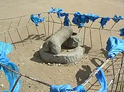 Lonely Planet says that the statue "points erotically to something interestingly called a 'vaginal slope'" which is hidden in a small valley, about 2 kilometres (1.2 mi) to the southeast of Erdene Zuu Monastery.[5] The river flowing in this basaltic rocky area originates from the Gyatruu range to Kharkhorin soum.[6] It is accessed from the main road by a well-used path. One can see a larger newer statue from the road from Ulaanbaatar road and 1 kilometre (0.62 mi) from Karakhorin hill. Many visitors seek the opportunity to visit the original statue, and many women also approach the site to seek blessings for a child to be born to them.[3] The smaller, 24 inches (610 mm) stone phallus is located within the grounds of the monastery itself, just to the northeast of the main monastery building.