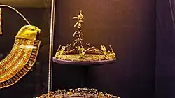 In the small chamber next to the sarcophagus were found further personal adornments. These included two crowns and parts of a necklace made in gold. The latter is most likely not an Egyptian work of art, but was perhaps produced in Crete.
