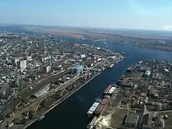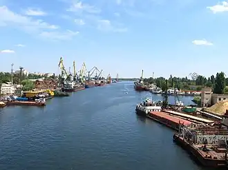 Kherson River Port (Ukrainian: Херсонський річковий порт) is a large transport hub in Kherson where river, sea, rail and road transport interconnect.[3] It is on the left bank of the Koshevaya or Koshova river,[3] leading up to where it enters the Dnieper river. It has seven ship berths along 950 metres of dock.[3]