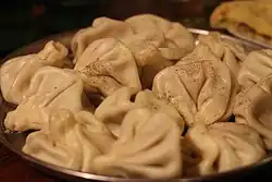 In Georgian cuisine, khinkali (Georgian: ხინკალი, romanized: khink'ali) is a kind of dumpling made of twisted knobs of dough, stuffed with spiced meat or vegetables.[1][2] Khinkali originate in the mountainous regions of eastern Georgia. The invention of the dish is credited to the Mokheves, as well as the Pshavs, Mtiuls, and Khevsurs. Traditionally, khinkali are made with coarsely chopped meat. In the mountain areas, this method of preparation is still used.