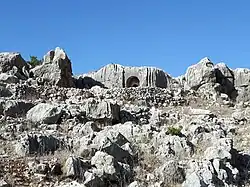 About 200 meters to the east of the ruins, in a quarry that was probably used to build the settlement's houses, a necropolis was found, where 18 burial caves with kokhim are visible, with a number of open-air trough tombs carved between them.[7][10]