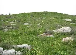 Discoveries include burial caves with remains from the Bronze, Iron, Hellenistic, Roman, Byzantine, and Arabic eras.[1] The eastern hill is still unexcavated, with visible remains of a 150-meter (490-foot) stone wall built with a double row of large stones, rock cuttings and two wine presses.