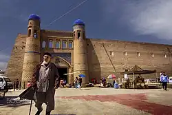 the Sayd Alauddin mausoleum, the Pahlavon Mahmud Complex, the Juma Mosque, the Old Ark, Oqshayx Bobo's Palace, Toshhovli Palace, Nurullabai Palace, Muhammad Aminxon Madrasah, Muhammad Rahimxon Madrasah, Islamkhodja Madrasah and Minaret, Olloqulixon Madrasah, Qutlughmurad Inoq Madrasah, Olloqulixon Caravanserai and its market, Anushakhan Bathhouse, Oq Mosque, Polvon Gate, Ota Gate, Bogcha Gate, Tosh Gate, Hazorasp Gate, Kush Gate, and more.[13][14][15]