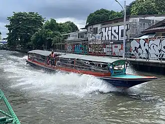 An express boat service operates on the Saen Saep between Pom Prap Sattru Phai and Bang Kapi Districts, providing ferry service in traffic-congested central Bangkok. The service has a checkered reputation, due to the polluted water in the khlong and the slapdash nature of the service. The northern line ends at Golden Mount, and the southern line ends at NIDA. Boats go past Watthana and Huai Khwang Districts, running parallel to Petchaburi Road.