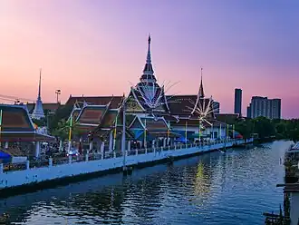Bordering historic temples the canal apart from Wat Apson Sawan include Wat Paknam Bhasicharoen, Wat Nang Chi, Wat Khun Chan, Wat Ratchaorot, Wat Nang, Wat Nangnong, Wat Sai and its floating market, Wat Sing, Wat Kamphaeng, Wat Kok, Wat Tha Kham, Wat Bang Kradi, Wat Hua Krabue, Wat Ban Rai Charoenpon, and Phan Thai Norasing Shrine, etc.[1]