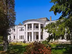 The palace is an example of neoclassical architecture uniting the forms of Renaissance and Classicism. The building has two floors, and is quadratic, with towers on the main façade and corners. There was a dome rotunda on the roof but it was knocked off by a Soviet air attack during World War II.