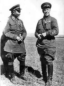 In 1936 Choibalsan and Gelegdorjiin Demid were appointed Marshals of the Armed Forces while Choibalsan also became head of the newly elevated Ministry of Internal Affairs, 26 percent of whose staff were NKVD agents.[28] Acting under Moscow's directive, Choibalsan then had Genden purged in March 1936 for sabotaging Mongol-Soviet relations by rejecting Stalin's demand that he eliminate the country's Buddhist clergy.[29] Genden was removed from his offices of the prime minister and foreign minister, arrested, and sent to Moscow, where he was executed a year later. Anandyn Amar became Prime Minister in his place.