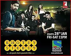 Khotey Sikkey (transl. Fake Coins) is a crime television series that aired on Sony TV. It premiered on 28 January 2011. The show revolves around an unlikely gang of five privileged youngsters and one stubborn cop. The group researches the crime activities in Mumbai.[1] The series produced by Yash Raj Films.