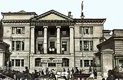 In 1848, the Kyiv Post Office moved from its former location at the intersection of Andreevskaya Street and Alexandrovskaya street to Khreshchatyk 26. At that time, the building had a height of three floors.[2] The Post Office opened in the former manor house of the palace, with mail carriages stationed in its courtyard.[1]