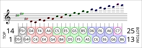 The layout is also unique. The outer row buttons correspond to the notes on the staff line while the inner row buttons - to the note between the lines. The three top buttons, one of the inner row and two of the outer row, are accidentals (G#, D#, F#). In professional models with 27 buttons two additional bottom buttons are C# and A#, & some w/ 29 buttons made by Belarus have 2 more high notes on the top which are High D, & High E. The buttons 3-25 (or 27) are notes of a diatonic scale arranged in a zigzag way (like bayan).