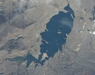 The lake is connected to Khoton Lake by a wide and short channel (about 2 km (1 mi)); both, together with the Dayan Lake, feed the Khovd River.[1] Khurgan Lake is located within the Altai Tavan Bogd National Park.[2]