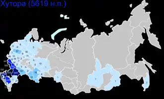 They existed in Cossack-settled lands that encompassed today's Ukraine, Kuban, and the lower Don River basin while in Kuban and Don region the word khutor was also used to describe new settlements (irrespective of the number of homesteads) which had detached themselves from stanitsas.[5] In some Cossack communities, these types of settlements were referred to as posyolok (Russian: посёлок) or selyshche (Ukrainian: селище). In Russia the term "выселки" (vyselki, literally, "those who moved away") was also used. Khutor remains the official designation of many Russian villages in these regions.