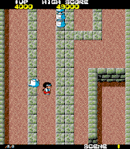 Kiki Kaikai is an overhead multi-directional shooter game that requires the player to move in four directions through various levels while attacking harmful enemies as they approach from off screen. As Sayo-chan, the player can attack by either throwing her special o-fuda scrolls in eight separate directions, or by swinging her purification rod directly in front of her. These techniques can be upgraded by finding special paper slips left by defeated enemies that will either enhance their power or improve their range. Sayo can be damaged by coming in contact with an enemy, and can only be hit once before she is knocked out and must resume the level from a preset continuation point. At the end of each level, the player must face a powerful boss monster that takes several attacks to defeat and is more difficult than normal enemies.[3]