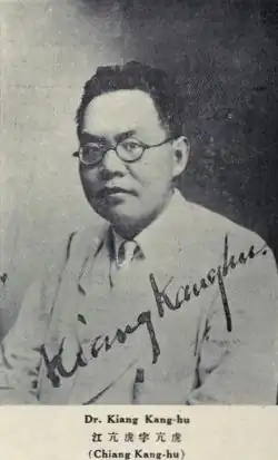 Jiang Kanghu (Chinese: 江亢虎; pinyin: Jiāng Kànghǔ; Wade–Giles: Chiang K'ang-hu; Hepburn: Kō Kōko), who preferred to be known in English as Kiang Kang-hu, (July 18, 1883 – December 7, 1954), was a politician and activist in the Republic of China. His former name was "Shaoquan" (紹銓) and he also wrote under the name "Hsü An-ch'eng" (許安誠).[1]