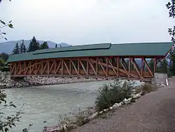 Kicking Horse Pedestrian Bridge in Golden is the longest authentic covered timber-frame bridge in Canada.[3] Planned as a community project by the Timber Framers Guild, local volunteers were joined by carpenters and timber framers from Canada, the United States and Europe. The bridge structure is 150 feet (46 m) long, with a 210,000-pound (95,000 kg) Burr arch structure. The bridge was completed in September 2001.