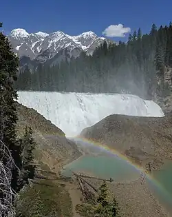 The river has three waterfalls along its stretch. The first is the Kicking Horse Cascade, a long talus cascade which occurs just below the first highway crossing of the river below Wapta Lake. The second is the Natural Bridge Falls near Field. The final and largest is 100-foot (30 m) Wapta Falls, one of the largest waterfalls in Canada in both volume and width. They are over 500 feet (150 m) wide.
