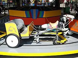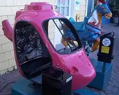 A kiddie ride[1] is a child-sized, themed, mildly interactive coin-operated ride that can be ridden by young children for amusement. Kiddie rides are commonly available in amusement parks, arcades, malls, hotel game rooms, outside supermarkets, and large department stores. Less commonly, they may also appear in other venues such as restaurants, food courts, grocery shops, and auto dealerships. When activated by a coin, a kiddie ride entertains the rider for a short time with a mild motion that replicates the theme of the ride. Most rides also include sounds and music. Some even feature flashing lights, pedals, and/or buttons. Commercial kiddie rides are often colorful with an animal, vehicle, or popular cartoon character theme, which appeals to young children. They are usually driven by a heavy-duty electric motor, which is usually disguised inside or underneath the metal, fiberglass, or vacuum formed plastic body of the ride.