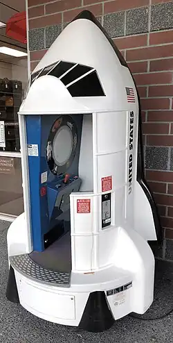 A kiddie ride[1] is a child-sized, themed, mildly interactive coin-operated ride that can be ridden by young children for amusement. Kiddie rides are commonly available in amusement parks, arcades, malls, hotel game rooms, outside supermarkets, and large department stores. Less commonly, they may also appear in other venues such as restaurants, food courts, grocery shops, and auto dealerships. When activated by a coin, a kiddie ride entertains the rider for a short time with a mild motion that replicates the theme of the ride. Most rides also include sounds and music. Some even feature flashing lights, pedals, and/or buttons. Commercial kiddie rides are often colorful with an animal, vehicle, or popular cartoon character theme, which appeals to young children. They are usually driven by a heavy-duty electric motor, which is usually disguised inside or underneath the metal, fiberglass, or vacuum formed plastic body of the ride.