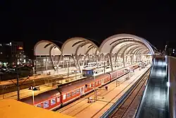 In 1999, a comprehensive renovation of the station started. Among other things, it received a new lobby. The intermediate level of the historic hall was removed and thus the former ceiling height were restored. The pedestrian walkway to the bus station on the north side of the station was demolished without replacement and the pedestrian walkway to the Sophienhof shopping centre was replaced by a steel and glass structure. The redesigned station forecourt and the foyer with shops on the concourse were inaugurated for Kiel Week in June 2004. The imperial steps on the east side have been restored. Due to financial and technical difficulties, the reconstruction was interrupted several times and only concluded in May 2006[4] with the completion of a new station hall, only the cross-walk at the end of the platforms is still in its original condition although it has been refurbished. The total cost of the conversion amounted to €60 million. The cost for the work in the station hall was estimated to cost around €30 million.[4] From 2013, there will be a further renovation of the station with the creation of tracks 2a and 6a. Track 2a was built outside the train shed with a connection to the platform for tracks 1 and 2. Tracks 6a is also built outside the train shed with a connection to the platform for tracks 5 and 6. These are needed to cope with the additional traffic on the Kiel-Rendsburg (-Fockbek) route and the Kiel–Schönberger Strand route from 2014.[5]