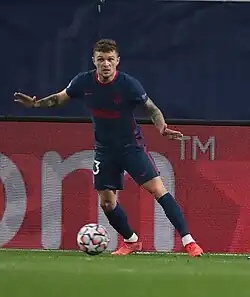 Trippier signed for La Liga club Atlético Madrid on 17 July 2019 on a three-year contract, for a fee of £20 million plus add-ons.[62][63] He became Atlético's first English player in 95 years.[64] In his debut on 18 August in their opening La Liga match against Getafe, he helped the team to a 1–0 home win by providing an assist for Álvaro Morata's goal.[65] In December 2020, Trippier was given a 10-week worldwide football ban and fined £70,000 for four breaches of Football Association betting rules after he allegedly passed on information on his transfer to his friends, who then placed bets on his transfer.[66][67] Atlético requested a review and the ban was suspended by FIFA until the case was decided by the Court of Arbitration for Sport (CAS).[68][69] CAS rejected the appeal,[70] and Trippier sat out his ban until his return to the team for the Madrid derby against Real Madrid on 7 March 2021,[71] which ended in a 1–1 draw.[72]