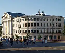 The university occupies the grounds of the Kyiv-Mohyla Academy in the Podil neighborhood, from Kontraktova Square to the Dnipro River.[93] The campus of NaUKMA is composed of a number of buildings constructed in the times of its predecessor institutions. The oldest buildings date from the 17th century, and include the Halshka Hulevychivna house and the old academic building also called the Mazepa building in honor of its financier Hetman Ivan Mazepa. The Mazepa building contains the congregation hall for ceremonial events, the Center for Contemporary Art and the research library.[94]