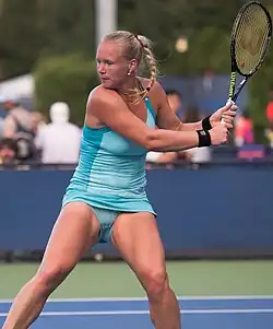 Bertens was a baseline player, who was noted for her ability to combine her exceptional defensive skills with an aggressive mindset. As she played aggressively, taking the ball early on the rise, she tended to hit large numbers of both winners and unforced errors. Bertens' greatest asset was her forehand, which was powerful and hit with heavy topspin, allowing her to hit winners from any position on the court. Her heavy topspin forehand had the added benefit of pushing her opponents behind the baseline, forcing them to play defensively from the first stroke.[47] Her two-handed backhand was also strong, and she was able to dictate play using this stroke; despite this, her backhand was less reliable than her forehand, and her backhand was responsible for the majority of the unforced errors she committed on the court. She was adept at applying slice to her backhand, which allowed her to break up the pace of baseline rallies, and draw unforced errors from more aggressive players. Her first serve was powerful, typically being delivered at 105 mph (169 km/h), and peaking at 110 mph (177 km/h), allowing her to serve aces, and dictate play from the first stroke of the rally. Bertens' second serve was less reliable, leading to a relatively high double fault count; throughout her career, however, Bertens began to develop a more effective kick serve, which minimised double faults.[48] Despite being an effective net player due to her doubles experience, Bertens rarely approached the net when playing singles, except to retrieve short balls, or to attack the net when the opportunity arose. Bertens possessed an exemplary drop shot, and was one of the strongest exponents of this shot on the WTA Tour; this shot was especially effective on clay courts, where she would deploy the shot during long baseline exchanges, to surprise opponents and move them around the court. Due to her exceptional fitness, movement, fitness, footwork, and court coverage, Bertens was an adept counterpuncher, and these skills allowed her to execute her playing style with tremendous effect. Although Bertens experienced success on all surfaces, her favourite surface was clay, where the high bounce and slow speed suited her playing style; her clay court game was aided by her ability to slide and move effectively on the surface. Despite all these strengths, Bertens' game was heavily affected by nerves throughout her career, and her lack of Grand Slam success despite being one of the most consistent players on the WTA Tour was credited to the nerves she felt when playing in front of large crowds.[49]