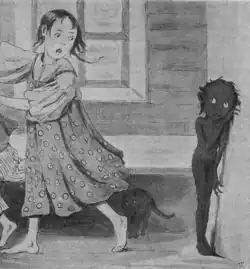 The swamp kikimora is usually described as a small, ugly, hunchbacked, thin, and scruffy old woman with a pointed nose and disheveled hair. She was said to use moss and grass as clothes. It was believed that she frightens people, knocks travelers off the road or even drowns them. She also kidnaps children.[10]