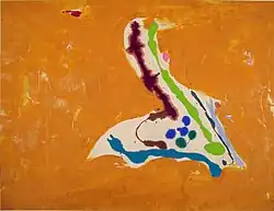 A commonality in the entire body of Saito's work, both on stage or on canvas, focuses on written signs. Repeated investigations of alphabet in Saito's work, both real and made-up, legible and obscured, speak to moments in his personal history.[4] As a young immigrant in a country whose language he did not speak, Saito wrote space for himself in the already-established Color Field tradition by constructing his own painterly lexicon. Opposing motifs of free gestural brushstrokes and elegant, ordered lettering allude again to his double practice as painter and architect of poetic performance. Abstraction in Saito's work points to a meditation on the instabilities and impermanence of language and the mutability of meaning. A space opens once departing from structuralist systems of transmuting signs, and Saito fills that space with vibrant color.