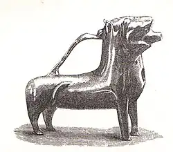 In 1868, a crannog, its causeway and up to four logboats were revealed at the south-west corner of the loch as a result of dumping of furnace-slag from the now closed ironworks,[6] causing the lake-bed sediments to be pushed upwards so that the crannog and logboat remains were exposed above the surface of the water. A site known as 'The Cairn' was already recognised, being exposed during exceptionally low water conditions.[20] The crannog and causeway are marked on the 1st edition of the OS 6-inch map (Ayrshire, sheet viii) at NS 3238 5356. Two of the boats were recorded in some detail. The most complete of the longboats was 18 ft (5.5 m) in length, 3 ft (0.91 m) in breadth and circa 2 ft (0.61 m) in 'depth'; about 2 ft (0.61 m) had been lost from the bow. The stern was 'square'. A tripod pit and a bronze ewer were found in one of the boats, now preserved at the Royal Museum of Scotland. These items were not contemporary with the logboat.[21] The boat itself disintegrated rapidly on exposure to air. Part of a second logboat was subsequently found 'close by the island'; its fate is not recorded. This boat was worked from 'oak'.[22]