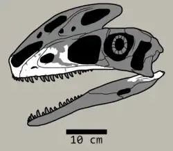 Kileskus (meaning lizard in the Khakas language) is a genus of tyrannosauroid dinosaur known from partial remains found in Middle Jurassic (Bathonian stage) Itat Formation of Sharypovsky District, Krasnoyarsk Krai (Russia). Fossils recovered include the holotype maxilla, a premaxilla, a surangular, and a few bones from the hand and foot.[1] Additional remains referred to the species include cervical and caudal vertebrae, as well as a fibula.[2] The skull bones are similar to those of Proceratosaurus. The type species is K. aristotocus. Kileskus was named in 2010 by Averianov and colleagues.