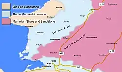 Immediately to the north and west the bedrock is limestone (later to be sourced from nearby Lixnaw and Abbeydorney for use in lime kilns). These rocks, as part of the Western Irish Namurian Basin (or Clare Basin) were formed in a sub-equatorial tropical environment, due to the deposition of fine particles in a delta, likely from a river flow to the south-west on a continental mass formed from what are now North America, Eastern Europe, Western Europe and Africa.[15] This area is thus part of the Iapetus Suture, that is a region where the ancient Iapetus Ocean closed up. The Atlantic Ocean had yet to form.